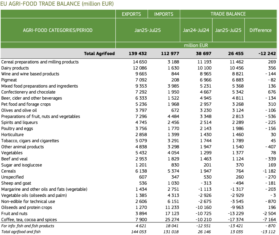 Cresce a luglio il surplus commerciale agroalimentare UE raggiungendo i 4,6 miliardi di euro (+19% mese su mese), ma resta inferiore rispetto allo stesso mese dell’anno scorso. Nei primi sette mesi dell’anno il surplus totale dell’UE si attesta a 26,5 miliardi di euro, in calo di 12,2 miliardi di euro rispetto allo stesso periodo del 2024. Questo a causa dell’aumento dei prezzi delle importazioni dall’UE, in particolare di cacao e caffè.