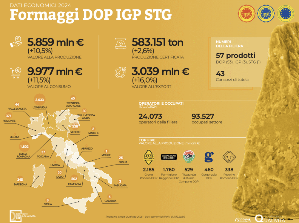 La categoria dei formaggi conta 57 denominazioni e rappresenta quasi il 61% del valore alla produzione e il 59% del valore dell’export del comparto cibo IG.