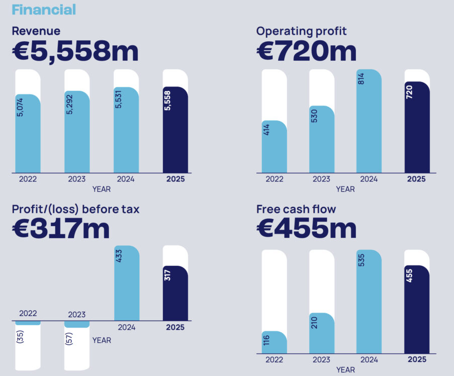 La crescita delle vendite dello 0,5% (utilizzando i tassi di cambio effettivi) si è tradotta in un aumento dell’utile lordo, sostenuto da un miglioramento del mix verso i marchi di fascia alta, dal recupero dei costi dei fattori di produzione e dalle continue efficienze di approvvigionamento e produzione. Il margine lordo in percentuale è superiore di 0,4 p.p. rispetto al 2024 nonostante le pressioni inflazionistiche, in particolare sul cacao, grazie al miglioramento delle performance degli stabilimenti. Il margine EBITDAE del 21,6% rappresenta un miglioramento di 0,2 p.p. rispetto all’anno precedente grazie a una combinazione di miglioramento del mix, efficienze negli acquisti e programmi “Take Costs Out”, nonché al recupero dei costi di produzione.