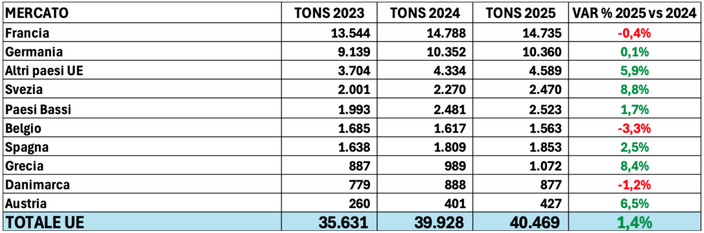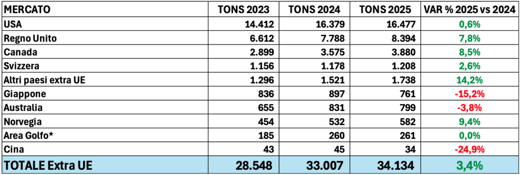 La quota export supera la metà del totale, attestandosi al 50,5% (pari a 74.980 t.), con una crescita del +2,7%. Tra i principali mercati, performance positive si registrano nel Regno Unito (+7,8%, 8.400 t), Canada (+8,3%, 3.900 t) e Svezia (+8,8%, 2.500 t). Anche gli Stati Uniti hanno confermato un trend positivo (+2,3%, 16.800 t). Stabili i volumi destinati a Francia (-0,3%, 14.800 t) e Germania (+0,1%, 10.400 t).