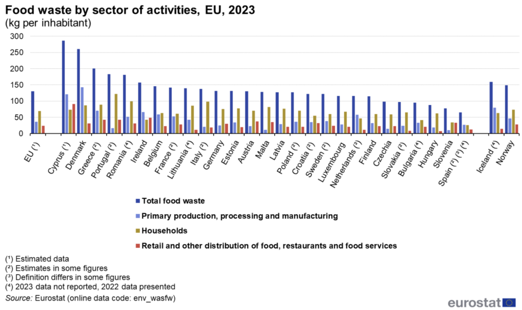 Nel 2023, l’UE ha sprecato circa 130 chilogrammi (kg) di cibo a persona. In totale, l’UE ha prodotto 58,2 milioni di tonnellate di rifiuti alimentari, commestibili e no. Rispetto al 2022 vi è stato un leggero aumento dello spreco alimentare pari al +0,7% (57,8 milioni di tonnellate). Eurostat ha appena diffuso i dati preconsuntivi nel merito.